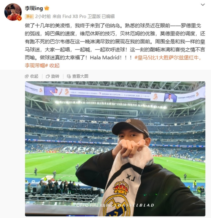 北京时间23日凌晨,皇马在欧冠5-1大胜萨尔茨堡红牛。演员李现到现场观战,并在社媒晒照。